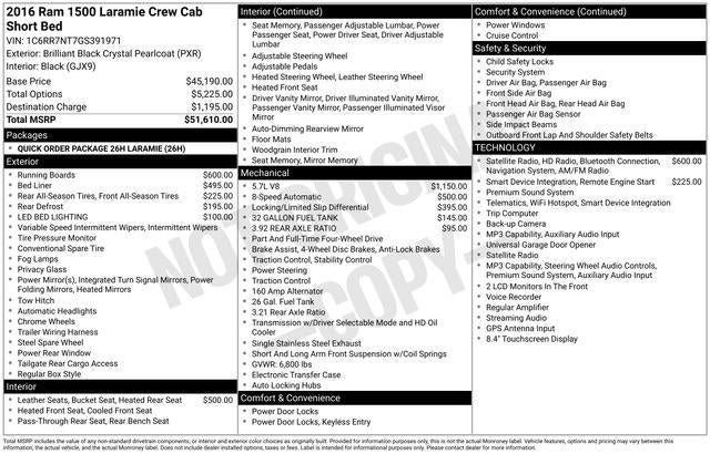 Recent Arrival! With some available options like Quick Order Package 26H Laramie, 1 Yr. Trial (Registration Required), 10 Speakers, 115V Auxiliary Power Outlet, 20 x 9 Chrome Clad Aluminum Wheels, 32 Gallon Fuel Tank, 4-Wheel Disc Brakes, 5-Year SiriusXM Traffic Service, 5-Year SiriusXM Travel Link Service, 8.4 Touchscreen Display, ABS brakes, Active Grille Shutters, Adjustable pedals, Air Conditioning, Alloy wheels, AM/FM radio, Anti-Spin Differential Rear Axle, Audio memory, Auto-dimming door mirrors, Auto-dimming Rear-View mirror, Automatic temperature control, Brake assist, Bumpers: chrome, Center Hub, Compass, Delay-off headlights, Driver door bin, Driver vanity mirror, Dual front impact airbags, Dual front side impact airbags, Electronic Shift, Electronic Stability Control, Emergency communication system: Uconnect Access, Folding Flat Load Floor Storage, Front anti-roll bar, Front Center Armrest w/Storage, Front dual zone A/C, Front fog lights, Front reading lights, Front wheel independent suspension, Fully automatic headlights, Garage door transmitter, GPS Antenna Input, GPS Navigation, HD Radio, Heated door mirrors, Heated Front Seats, Heated front seats, Heated steering wheel, High Back Seats, Illuminated entry, Integrated Voice Command w/Bluetooth®, Leather steering wheel, Leather Trim 40/20/40 Bench Seat, LED Bed Lighting, Low tire pressure warning, Media Hub (SD, USB, AUX), Memory seat, Occupant sensing airbag, Outside temperature display, Overhead airbag, Overhead console, Panic alarm, ParkView Rear Back-Up Camera, Passenger door bin, Passenger vanity mirror, Pedal memory, Power 10-Way Memory Driver & 6-Way Passenger Seats, Power door mirrors, Power driver seat, Power passenger seat, Power steering, Power windows, Radio data system, Radio: Uconnect 8.4, Radio: Uconnect 8.4 NAV, Rear 60/40 Split Folding Seat, Rear anti-roll bar, Rear seat center armrest, Rear step bumper, Rear Window Defroster, Remote keyless entry, Remote Start System, Security system, SIRIUSXM Satellite Radio, SIRIUSXM Traffic, SiriusXM Travel Link, Speed control, Split folding rear seat, Spray In Bedliner, Steering wheel mounted audio controls, Tachometer, Tilt steering wheel, Tip Start, Traction control, Trip computer, Turn signal indicator mirrors, Uconnect Access, Uconnect Access 1 Year Trial, Variably intermittent wipers, Ventilated Front Seats, Ventilated front seats, Voltmeter, and Wheel to Wheel Side Steps. 2016 4D Crew Cab 4WD Ram 1500 Brilliant Black Crystal Pearlcoat Laramie 8-Speed Automatic