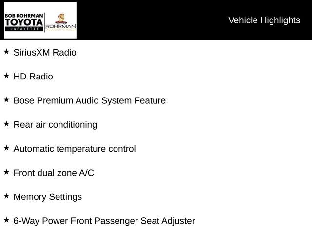 - AM/FM Stereo w/Navigation, Bose Premium Audio System Feature, Floor Console w/Storage Area, HD Radio, Single-Slot CD/MP3 Player, SiriusXM Radio, Automatic temperature control, Front dual zone A/C, Rear air conditioning, 12-Volt Auxiliary Power Outlet (5), 6-Way Power Front Passenger Seat Adjuster, Memory seat, Memory Settings, Power-Adjustable Accelerator & Brake Pedals, Remote keyless entry, Steering wheel mounted audio controls, Universal Home Remote, 4-Wheel Antilock Disc Brakes, Remote Vehicle Start, Power Liftgate, Exterior Parking Camera Rear, Auto High-beam Headlights, Fully automatic headlights, Driver Inboard & Front Passenger Airbags, Extended-Range Remote Keyless Entry, Electronic Cruise Control w/Set & Resume Speed, Black Assist Steps, IntelliBeam w/Automatic High Beam On/Off, Power door mirrors, 1st & 2nd Row Color-Keyed Carpeted Floor Mats, Apple CarPlay/Android Auto, Auto-Dimming Inside Rear-View Mirror, Color-Keyed Carpeting Floor Covering, Forward Collision Alert, Illuminated entry, Lane Keep Assist w/Lane Departure Warning, Leather-Wrapped Steering Wheel, Low Speed Forward Automatic Braking, Outside temperature display, Rear Park Assist w/Audible Warning, Safety Alert Seat, SiriusXM NavTraffic, 2nd Row 60/40 Split-Folding Manual Bench, 3rd Row Manual 60/40 Split-Folding Fold Flat Bench, 3rd row seats: split-bench, Front Bucket Seats, Front Center Armrest, Heated Front Reclining Bucket Seats, Heated front seats, Leather-Appointed Seat Trim, Power passenger seat, Split folding rear seat, Roof-Mounted Luggage Rack Side Rails, Alloy wheels