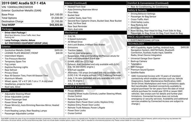 Recent Arrival! AWD, Jet Black Leather. With some available options like Preferred Equipment Group 4SA, AWD, Jet Black Leather, 155 Amp Alternator, 18 x 7.5 Aluminum (4) Wheels, 3.16 Axle Ratio, 3rd row seats: split-bench, 4-Wheel Disc Brakes, 6-Passenger (2-2-2 Seating Configuration), 8 Speakers, 8-Way Power Front Passenger Seat Adjuster, ABS brakes, Air Conditioning, Alloy wheels, AM/FM radio: SiriusXM, Apple CarPlay/Android Auto, Auto-dimming door mirrors, Auto-dimming Rear-View mirror, Automatic temperature control, Bose Premium 8-Speaker System, Brake assist, Bumpers: body-color, Compass, Delay-off headlights, Driver door bin, Driver vanity mirror, Dual front impact airbags, Dual front side impact airbags, Electronic Stability Control, Emergency communication system: OnStar and GMC connected services capable, Exterior Parking Camera Rear, Four wheel independent suspension, Front anti-roll bar, Front Bucket Seats, Front Center Armrest, Front dual zone A/C, Front fog lights, Front License Plate Bracket, Front reading lights, Fully automatic headlights, Garage door transmitter, Heated door mirrors, Heated Driver & Front Passenger Seats, Heated front seats, Illuminated entry, Knee airbag, Low tire pressure warning, Occupant sensing airbag, Outside temperature display, Overhead airbag, Overhead console, Panic alarm, Passenger door bin, Passenger vanity mirror, Perforated Leather-Appointed Seat Trim, Power door mirrors, Power Driver Lumbar Control Seat Adjuster, Power driver seat, Power Liftgate, Power Passenger Lumbar Control Seat Adjuster, Power passenger seat, Power steering, Power windows, Premium audio system: GMC Infotainment System, Radio data system, Radio: AM/FM w/8 Diagonal Color Touch Screen, Radio: AM/FM w/8 Diagonal Color Touch Screen & Nav, Rear air conditioning, Rear anti-roll bar, Rear reading lights, Rear window defroster, Rear window wiper, Remote keyless entry, Roof rack: rails only, Security system, SiriusXM Radio, Speed control, Speed-sensing steering, Spoiler, Steering wheel mounted audio controls, Tachometer, Telescoping steering wheel, Tilt steering wheel, Traction control, Trip computer, Variably intermittent wipers, and Voltmeter. 2019 4D Sport Utility AWD GMC Acadia Quicksilver Metallic SLT-1 6-Speed Automatic
