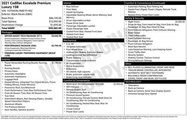 Clean CARFAX. 4WD, Black Leather. With some available options like Driver Assist Tech Package (Adaptive Cruise Control, Air Ride Adaptive Suspension, Automatic Seat Belt Tightening, Enhanced Automatic Emergency Braking, Illuminating Front & Rear Sill Plates, Reverse Automatic Braking, and Soft Closing Front & Rear Doors), Performance Package (Electronic Limited-Slip Differential, Hitch Guidance w/Hitch View, In-Vehicle Trailering System App, Integrated Trailer Brake Controller, Magnetic Ride Control Suspension, and Trailer Side Blind Zone Alert), Preferred Equipment Group 1SB (Air Ionizer, AKG Studio 19-Speaker Audio System, Automatic Emergency Braking, Door Lock & Latch Shields, Electronic Cruise Control w/Set & Resume Speed, Enhanced Automatic Parking Assist, Glass Breakage Sensor, Lane Change Alert w/Side Blind Zone Alert, Lane Keep Assist w/Lane Departure Warning, Mechanical Limited-Slip Differential, Power Panoramic Tilt-Sliding Sunroof, Rear Camera Mirror, Rear Camera Mirror Washer, Rear Cross Traffic Alert, Reconfigurable Full-Color Head-Up Display, Running Board Assist Steps, Theft-Deterrent Alarm System, Vehicle Inclination Sensor, and Vehicle Interior Movement Sensor), 4WD, Black Leather, 16.9 Diagonal OLED Infotainment Screen, 19 Speakers, 2-Presets Memory For Driver Seat Adjuster, 3.23 Axle Ratio, 3rd row seats: split-bench, 4-Way Power Driver Lumbar Seat Adjuster, 4-Way Power Front Passenger Lumbar Seat Adjuster, 4-Wheel Disc Brakes, 8-Way Power Driver Seat Adjuster, 8-Way Power Front Passenger Seat Adjuster, ABS brakes, Air Conditioning, Alloy wheels, AM/FM radio: SiriusXM with 360L, Apple CarPlay/Android Auto, Audio memory, Auto High-beam Headlights, Auto tilt-away steering wheel, Auto-dimming door mirrors, Auto-dimming Rear-View mirror, Automatic temperature control, Brake assist, Bumpers: body-color, Compass, Delay-off headlights, Driver door bin, Driver vanity mirror, Dual front impact airbags, Dual front side impact airbags, Electronic Stability Control, Emergency communication system: OnStar and Cadillac connected services capable, Four wheel independent suspension, Front anti-roll bar, Front Bucket Seats, Front Center Armrest w/Storage, Front dual zone A/C, Front reading lights, Fully automatic headlights, Garage door transmitter, HD Radio, Heads-Up Display, Heated & Ventilated Driver & Front Passenger Seats, Heated door mirrors, Heated Driver & Front Passenger Seats, Heated front seats, Heated rear seats, Heated steering wheel, Illuminated entry, Leather Seating Surfaces w/Mini-Chevron Perf Inserts, Leather steering wheel, Low tire pressure warning, Memory seat, Navigation System, Night Vision, Occupant sensing airbag, Outside temperature display, Overhead airbag, Overhead console, Panic alarm, Passenger door bin, Passenger vanity mirror, Power door mirrors, Power driver seat, Power Liftgate, Power moonroof, Power passenger seat, Power steering, Power windows, Power-Retractable Assist Steps, Premium Smooth Ride Suspension, Radio data system, Radio: AM/FM/SiriusXM w/Navigation, Rain sensing wipers, Rear air conditioning, Rear anti-roll bar, Rear reading lights, Rear Seat Entertainment System, Rear window defroster, Rear window wiper, Remote keyless entry, Roof rack: rails only, Security system, SiriusXM w/360L, Speed control, Split folding rear seat, Spoiler, Steering wheel memory, Steering wheel mounted audio controls, Tachometer, Teen Driver, Telescoping steering wheel, Tilt steering wheel, Traction control, Trip computer, Turn signal indicator mirrors, Variably intermittent wipers, Ventilated front seats, Voltmeter, Wheels: 22 14-Spoke Alloy w/Polished Finish, and Wireless Apple CarPlay/Wireless Android Auto. 2021 4D Sport Utility 4WD Cadillac Escalade Black Raven Premium Luxury 10-Speed Automatic with Overdrive Odometer is 17225 miles below market average!
