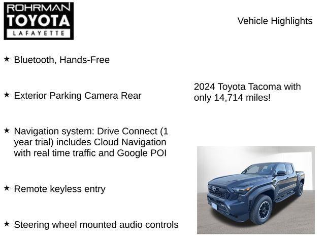 Experience the perfect blend of capability, efficiency, and advanced technology in the 2024 Toyota Tacoma Hybrid TRD Off Road. Schedule a test drive today and discover how this exceptional truck can elevate your driving experience.